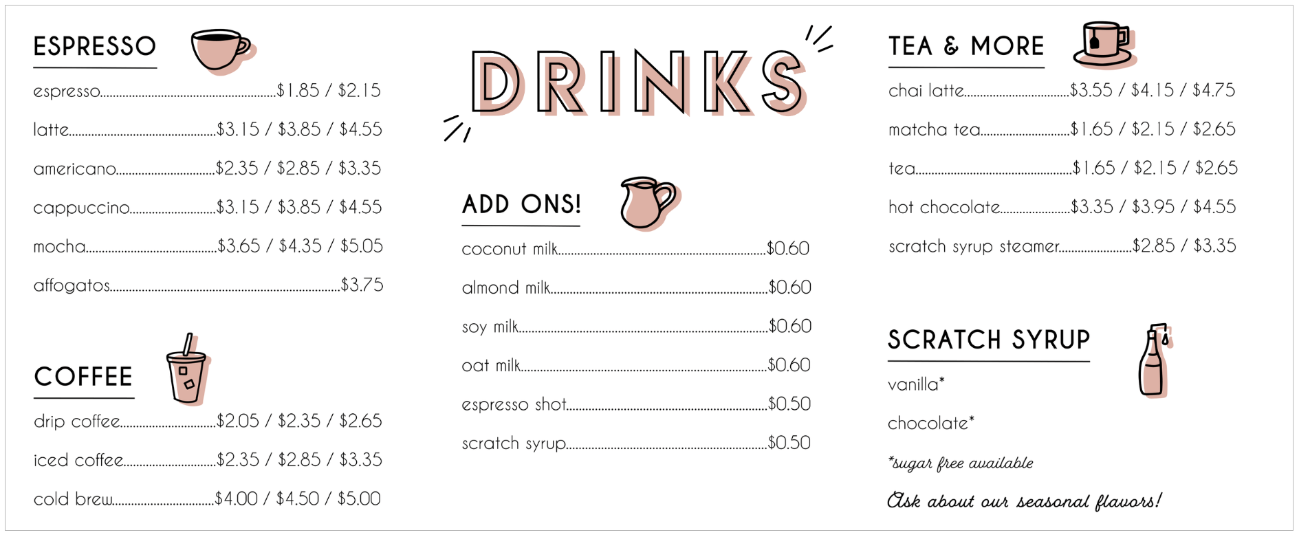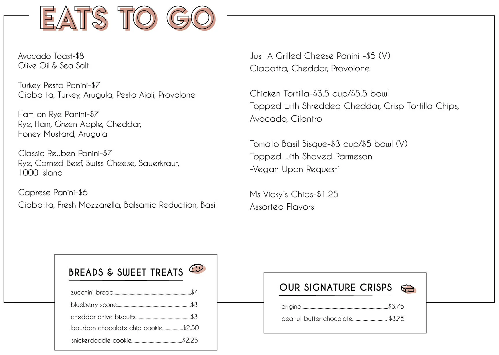 Offering both food & drinks (like Avocado Toast & Lattes) during Shelter-In-Place for pick-up and delivery orders (GrubHub & UberEats) and pick-up groceries!