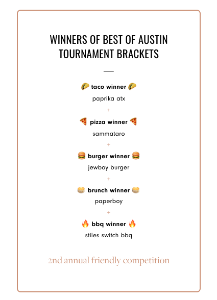 Since our Best of Austin Bracket Tournament wrapped up, we have announced our winners and wanted to share them here! Shortly, I will be visiting these winners and letting my followers know what I recommend to eat at each restaurant!